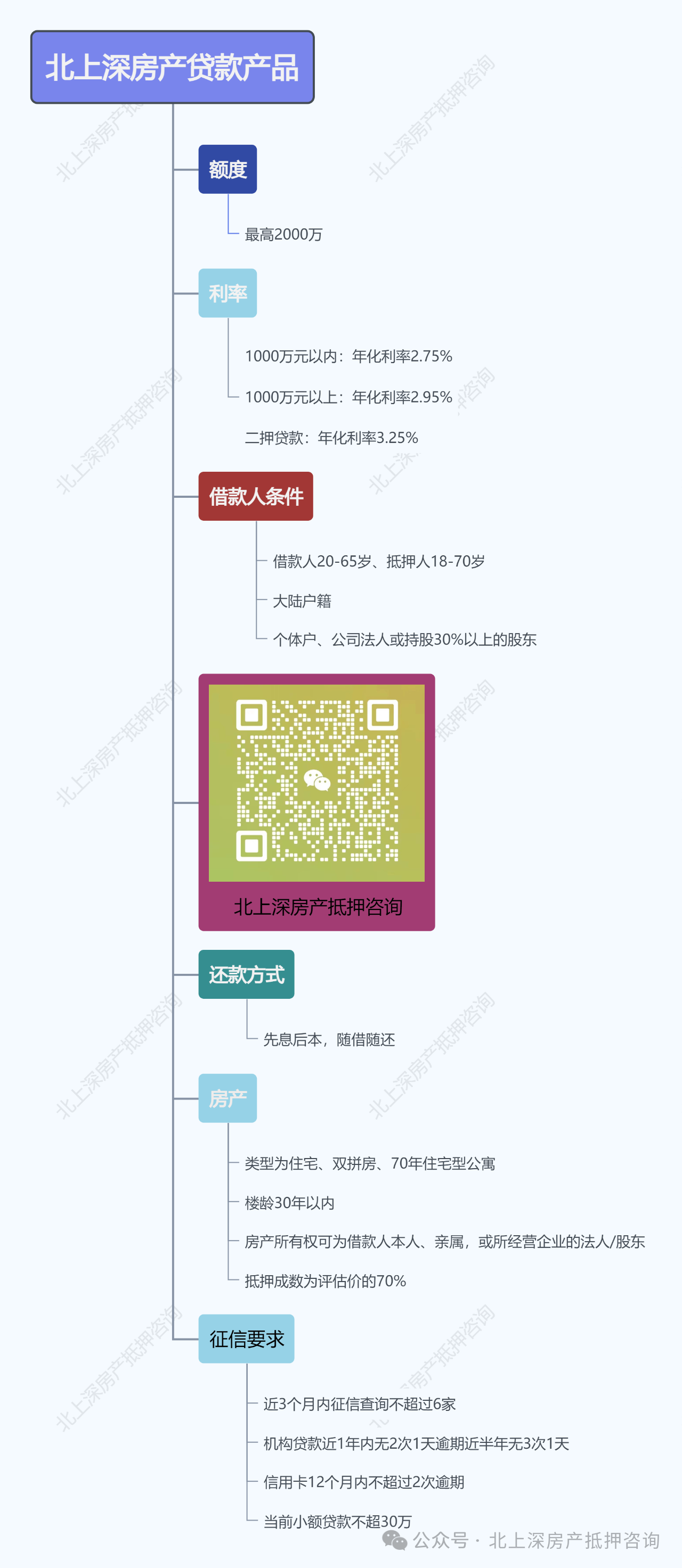 1000萬(wàn)元以內(nèi),年化利率為2.75%;1000萬(wàn)元以上,年化利率為2.95%;二押貸款,年化利率為3.25%。